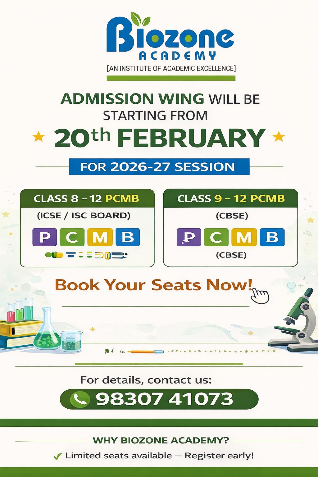 Biozone Academy provides comprehensive coaching for Classes IX–XII (PCMB) students across ICSE, CBSE, ISC, and State Boards, along with specialized guidance for JEE and NEET aspirants. In addition, the academy offers academic support for undergraduate students in Botany, Zoology, and Microbiology, ensuring a seamless transition from school to higher education.